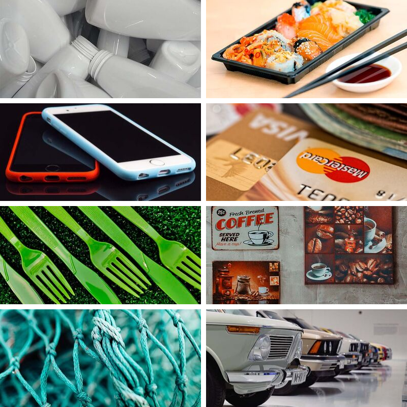 - Piezas de coche. Desde parachoques, revestimientos de suelos y maletero hasta los paneles de las puertas.